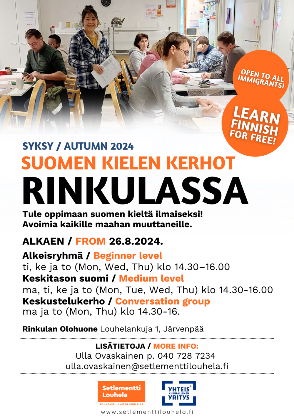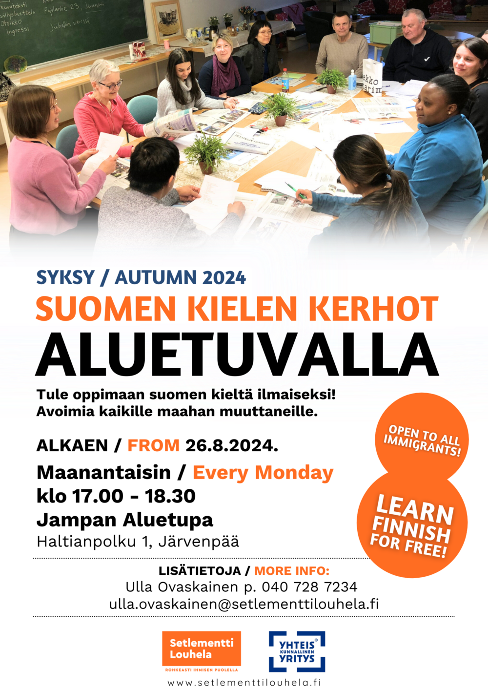 Tule oppimaan suomen kieltä ilmaiseksi Setlementti Louhelan suomen kielen kerhoihin! Rinkulassa ja Aluetuvalla kokoontuvat kielikerhot palaavat kesätauolta maanantaina 26.8.