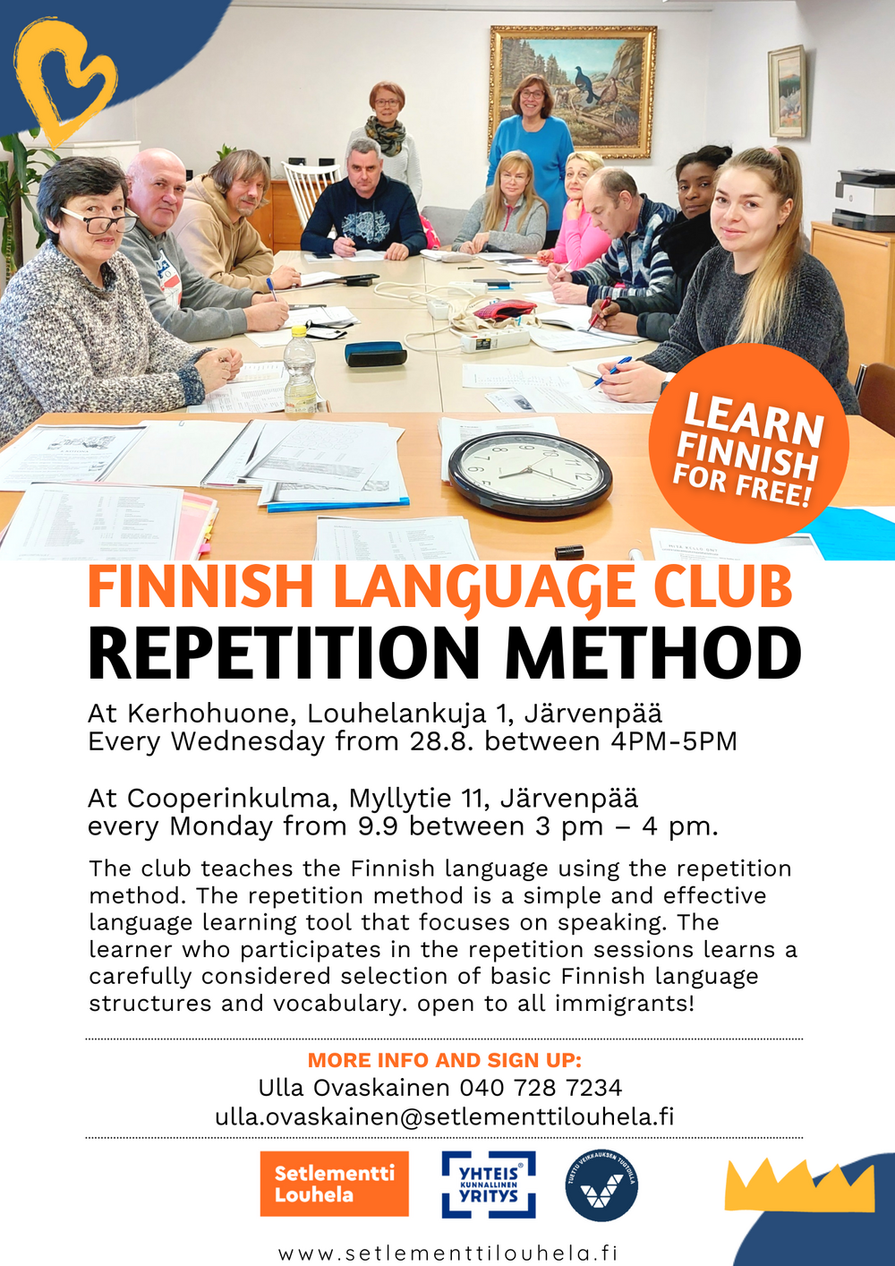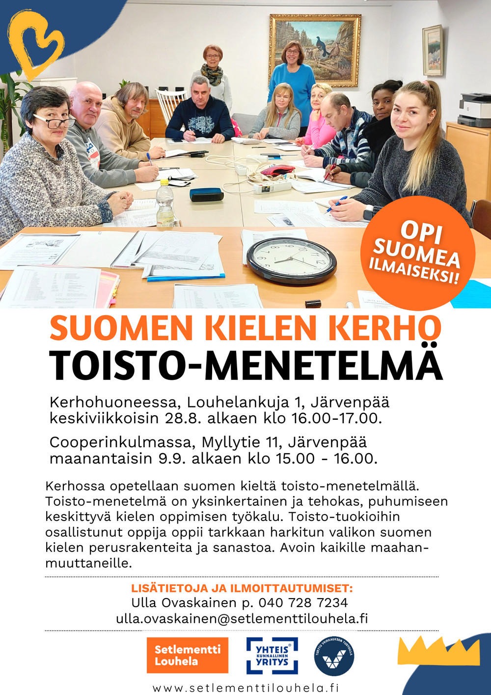 Suomen kielen kerho Toisto-menetelmällä jatkuu 28.8.2024 klo 16.00-17.00 ja kokoontuu kerran viikossa Kerhohuoneella (Louhelankuja 1, Järvenpää). Kerho on maksuton ja avoin kaikille maahan muuttaneille.